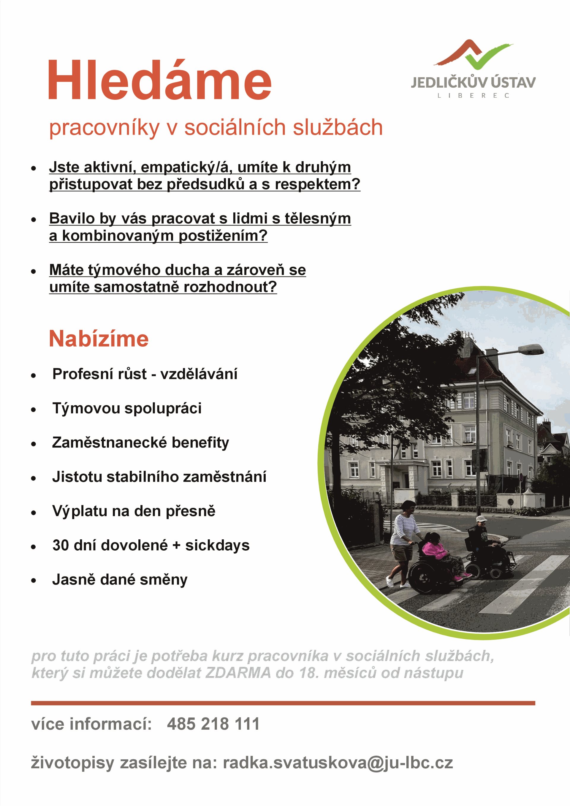Hledáme pracovníka v sociálních službách. Výběrové řízení je vyhlášeno na 25. 11. 2025. Prosím, zasílejte životopisy na e-mail radka.svatuskova@ju-lbc.cz.